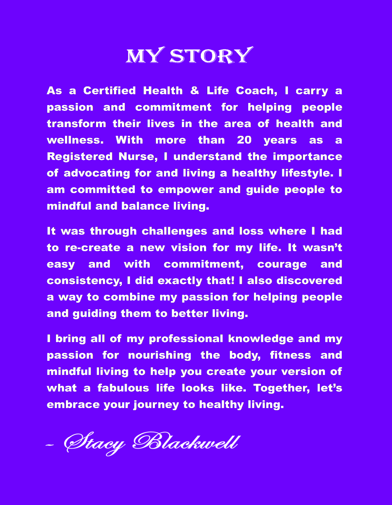 to the change you want to become. Together, we'll develop a powerful vision of what a fabulous and transformed life looks like for you. You'll receive one-on-one coaching, a tailor-made plan to help you reach your unique goals and most importantly, someone to encourage and support you through every step of your journey. I believe in small, consistent steps as powerful tools towards reaching your health goals. Start TODAY!
